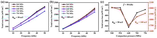 (a,b) Total core loss as a function of frequency for the Fe/PTFE SMCs containing 3 wt% PTFE at different pressures measured at (a) Bm = 50 mT and (b) 100 mT; (c) total core loss as a function of compaction pressure for the Fe/PTFE SMCs containing 3 wt% PTFE measured at 50 kHz for Bm = 50 mT and 100 mT, respectively.