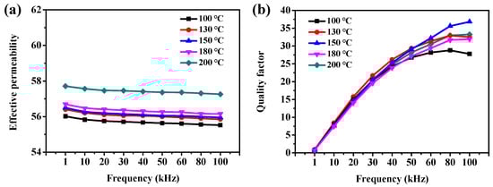 Annealing treatment can eliminate the defects and residual stress inside SMCs, which has a significant effect on the magnetic properties of SMCs. The Fe/PTFE SMCs containing 3 wt% PTFE were prepared by pressing at 648 Mpa, followed by annealing at 100–200 °C for 90 min. Figure 8a illustrates the frequency-dependent effective permeability of Fe/PTFE SMCs at different annealed temperatures. The effective permeability of all samples shows excellent stability over the entire frequency range with a slight decrease of about 8‰ as the frequency increases from 1 kHz to 100 kHz at different temperatures. Meanwhile, the effective permeability of Fe/PTFE SMCs increases gradually as the temperature increases from 100 °C to 200 °C and reaches its highest value of about 58 (Figure S2). This result is because the effective permeability of Fe/PTFE SMCs is inversely proportional to the residual stress (Equation (S4)). As the temperature increases from 100 °C to 200 °C, the residual stress gradually decreases. In addition, the enhanced grain growth as well as interparticle bonding also result in a gradual increment in effective permeability.