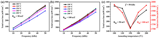 Figure 9 shows the total core loss of Fe/PTFE SMCs annealed at different temperatures. The total core loss of all samples increases sharply with increasing frequencies. Also, the total core loss gradually decreases from 443 mW/cm3 to 355 mW/cm3 (50 mT, 50 kHz) and from 1970 mW/cm3 to 1705 mW/cm3 (100 mT, 50 kHz) with increasing annealing temperature from 100 °C to 150 °C. As the annealing temperature further increases from 150 °C to 200 °C, the total core loss dramatically increases to 427 mW/cm3 (50 mT, 50 kHz) and 1963 mW/cm3 (100 mT, 50 kHz), respectively. When annealed at lower temperatures (below 150 °C), the increase in annealing temperature releases the internal stress caused by the rapid pressing process, which decreases the total core loss. However, the further increase in annealing temperature above 150 °C results in the insulation layer being broken, which leads to a decrease in resistivity, thus increasing the total core loss. At the same time, the quality factor reaches its highest value at higher frequencies (50–100 kHz) for the Fe/PTFE SMCs annealed at 150 °C. When the annealing temperature exceeds 150 °C, the broken insulation layer leads to a decrease in quality factor (Figure 8b). Therefore, a higher annealing temperature (~150 °C) is considered to be the optimal heat treatment for the Fe/PTFE SMCs.