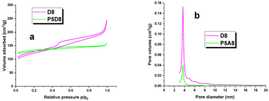The surface area of the biocarbons, the total pore and micropore volume, and the average pore diameter of the D8 and P5D8 samples were calculated using the nitrogen adsorption/desorption isotherms illustrated in Figure 1. The textural parameters are presented in tabular form in Table 1. The adsorbents were found to exhibit a relatively low specific surface area. It is conceivable that the temperatures employed during carbonisation and activation were inadequate to effectively develop the specific surface area. An additional possibility is that the temperature differential between the two processes was insufficient. The surface area of the samples obtained was that of the D8 and P5D8. The compiled values of specific surface area clearly indicate that the two-step physical activation process allows the production of an adsorbent with a microporous texture character, as also confirmed in Figure 1 and Figure 2. Table 1 shows that the pore diameters of the four samples analysed were within a narrow range, from 2.57 to 3.36 nm. The average pore size for the activated carbons provides evidence for the formation of mesopores with smaller sizes. Furthermore, the specific surface area of the samples correlates with their iodine number, as both parameters reflect the low degree of porosity of the carbonaceous material.