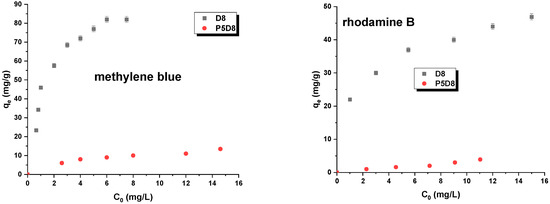 Isotherms of methylene blue and rhodamine B adsorption on D8 and P5D8 samples. Experimental conditions: C0 = 10–40 mg/L, mass = 0.020 g, adsorption time = 24 h, shaking speed = 200 rpm/min, temperature = 295 ± 1 K.