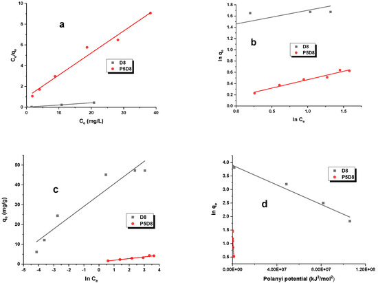 The adsorption of organic compounds on biocarbon can be described by a number of different adsorption isotherm models, including the Langmuir, Freundlich, Temkin and Dubinin–Radushkevich models. Table 4 presents the parameters of these isotherms, which were obtained through linear regression analysis, as well as the experimentally determined sorption capacities (Table 3, Figure 4). The straight lines representing these models are illustrated in Figure 5 and Figure 6. The data presented in Table 4 and Figure 4 clearly demonstrate that sample D8, obtained by activating the cellulose fibres utilised in the production of nappy mats, exhibited a markedly enhanced efficiency in the removal of the adsorbates under investigation. The carbon demonstrated the capacity to adsorb 84 mg/g of methylene blue and 47 mg/g of rhodamine B. In comparison, the experimental sorption capacities for sample P5D8 were observed to be below 15 mg/g. The results of the sorption capacity analysis indicate that the two-step physical activation of this specific precursor does not result in highly effective adsorbents for the removal of the pollutants under investigation. From an economic standpoint, this is a significant consideration, as an additional process step, such as pyrolysis, introduces additional costs in the synthesis of this type of material. Consequently, further research on this precursor should encompass the preparation of bio-adsorbents through direct activation with carbon dioxide, utilising varying temperatures and process times to obtain biomaterials with the most optimal textural and sorption characteristics.