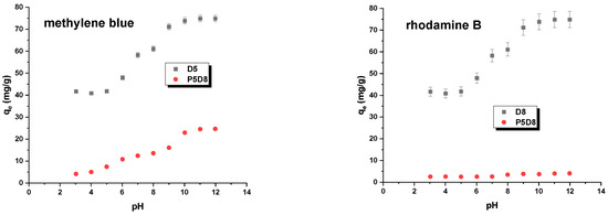 The pH of the environment in which the adsorption process occurs can also influence the efficiency with which toxic compounds and contaminants are removed. The pH of the solution is considered to be one of the most relevant parameters, as it has the potential to modify the charge of both the adsorbate and the adsorbent during the course of testing. Figure 9 illustrates the impact of pH on the sorption capacities obtained. The adsorption of organic pollutants is enhanced as the pH of the system increases. This parameter exerts a more pronounced influence on sample D8. It can be posited that pH exerts a more pronounced influence on the adsorption of methylene blue, as evidenced by the observation of a greater increase in sorption capacity with rising system pH for this dye. This phenomenon can be attributed to the electrostatic interactions between the negatively charged surface of the D8 and P5D8 samples and the methylene blue/rhodamine B molecules [39]. Furthermore, a pH value of the solution exceeding pHpzc signifies that the adsorbent surface is negatively charged, thereby facilitating interaction with positively charged methylene blue or rhodamine B. To guarantee that the surface of the biocarbon is negatively charged, the pH of the system should be higher than the pHpzc value of the biocarbon (Table 2).