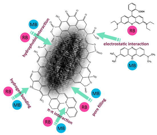 Interactions of methylene blue (MB)/rhodamine B (RB) with the surface of biocarbon.