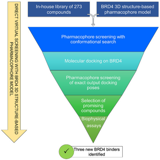 The implementation of the developed pharmacophore model in a drug repositioning campaign represented a convenient strategy [8], enabling the recovering of molecules originally designed and synthesized for specific proteins, which failed to yield positive biological results. In this work, we report on the building and successful use of a BRD4-specific pharmacophore model integrated into an in silico drug repositioning campaign, which led to the identification of several novel promising BRD4 binders.