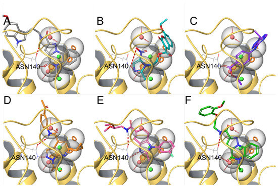 Compounds 1 (panel (A), colored by atom type: C gray, O red, N blue, polar H light gray), 2 (panel (B), colored by atom type: C turquoise, O red, N blue, polar H light gray), 3 (panel (C), colored by atom type: C violet, O red, N blue, polar H light gray), 4 (panel (D), colored by atom type: C orange, O red, N blue, polar H light gray), 5 (panel (E), colored by atom type: C pink, O red, N blue, polar H light gray, Cl light green), and 6 (panel (F), colored by atom type: C green, O red, N blue, polar H light gray) docking poses in BRD4 binding site (PDB code: 4QB3) superimposed onto developed BRD4 pharmacophore model. H bonds are highlighted in red.
