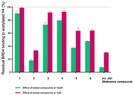 To validate the entire in silico pipeline and demonstrate its potential uses in drug discovery, we selected the AlphaScreen technique as a suitable assay for this purpose. Compared to other binding assays, AlphaScreen is a competitive assay that evaluates the ability of new compounds to displace the natural binder (histone H4/Ac for BRD4) from the BRD binding site [18]. In light of this, we tested the selected compounds 1–6 (Table 1) against BRD4(BD1) at concentrations of 10 µM and 1 µM (Figure 4). Interestingly, compounds 2, 5, and 6 demonstrated the ability to bind the target protein at both concentrations (residual binding of histone H4Ac: 18.2 ± 2.9% to 47.7 ± 0.3% at 10 µM and 33.5 ± 0.7% to 63.5 ± 4.9% at 1 µM). Compounds 3 and 4 showed only weak binding at 10 µM (residual binding of histone H4Ac: 72.9 ± 4.8% and 79.6 ± 4.7%, respectively), while compound 1 was the least active, with a residual binding of histone H4Ac at 90.3 ± 4.8% (Figure 4 and Table 2).
