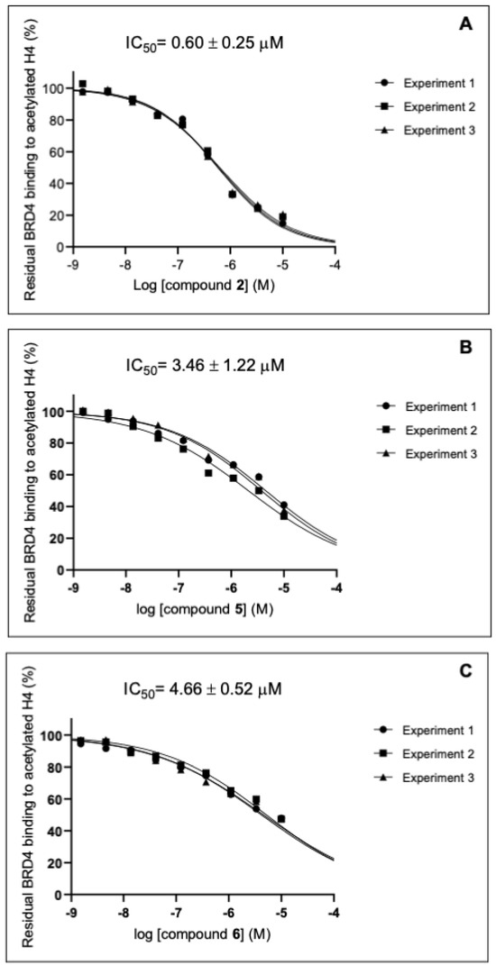 IC50 curves of compounds 2 (A), 5 (B), and 6 (C) on BRD4(BD1). Data are presented as means with standard deviation (SD), with n = 3.