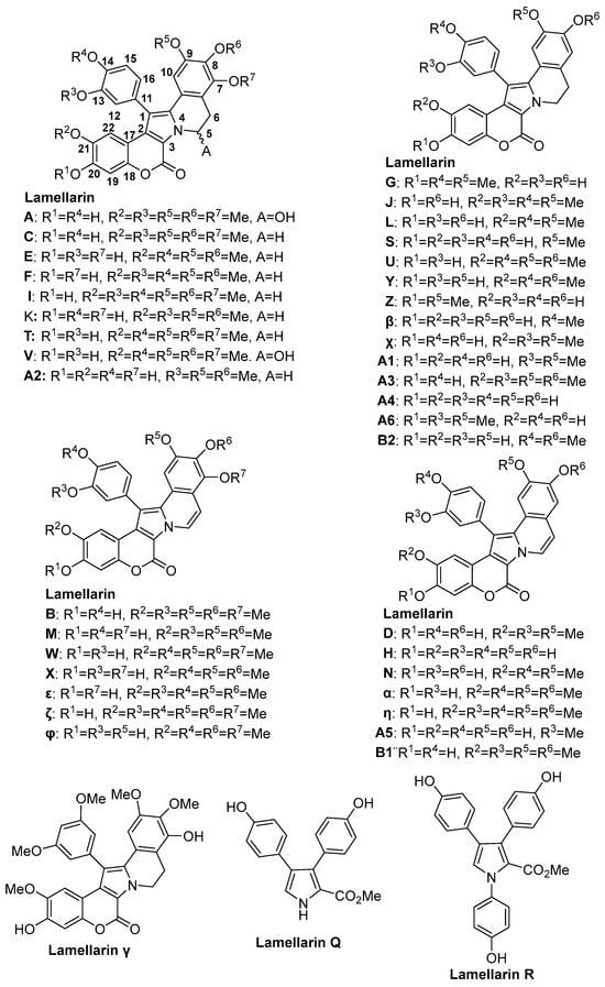 - Wei, M.; Chen, J.; Song, Y.; Monserrat, J.-P.; Zhang, Y.; Shen, L. Progress on synthesis and structure-activity relationships of lamellarins over the past decade. Eur. J. Med. Chem. 2024, 269, 116294. [Google Scholar] [CrossRef]