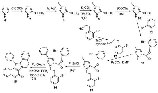 In 1998, Banwell et al. reported the synthesis of lamellarin framework 15 [77]. The synthesis started from the reaction of pyrrole (6) with trichloroacetyl chloride to trichloroacetyl derivative 7, which reacted with iodine in the presence of CF3CO2Ag to provide 4-iodinated adduct 8 (Scheme 2). Hydrolysis of the latter provided acid 9. The corresponding chloride 10 by reaction with o-bromophenol furnished ester 11. Alkylation at nitrogen of 11 with tosylate 12 yielded tri-substituted pyrrole 13. A Negishi cross-coupling of the latter with phenylzinc chloride chemoselectively afforded derivative 14 with 47% overall yield during the above steps. Double Heck cross-coupling reactions of 14 in the presence of Pd(OAc)2, PPh3, and NaOAc as base at 135 °C resulted in the final product 15 in low yield, 16%.