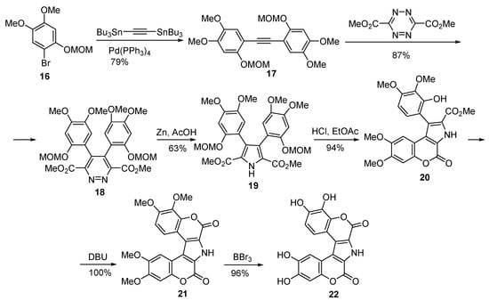 The next year, Boger et al., prepared ningalin A (22) using a heterocyclic azadiene Diels–Alder strategy for the construction of pyrrole core [78]. Double Stille cross-coupling of 1-bromo-4,5-dimethoxy-2-(methoxymethoxy)benzene (16) with bis-(tributylstannyl)acetylene provided diarylacetylene 17 (Scheme 3). Diels–Alder cycloaddition reaction of 17 with tetrazine derivative afforded diazine adduct 18. Reductive ring contraction of the latter with zinc furnished pyrrole derivative 19. Deprotection of MOM ethers with HCl led to monolactone 20, which with the more forcing conditions of DBU resulted in tetramethyl ningalin A (21). Treatment with BBr completed the total synthesis of ningalin A (22) in 39% total yield.