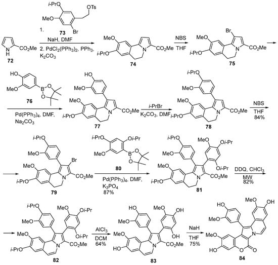 Pla et al. [86] synthesized the cytotoxic lamellarin D (84) in 8 steps and 18% overall yield from methyl pyrrole-2-carboxylate (72) using sequential bromination/Suzuki cross-coupling reactions like the above-mentioned procedure by Handy [85]. N-alkylation of 72 with tosylate 73 followed by Heck cross-coupling and cyclization furnished dihydroisoquinoline framework 74 (Scheme 10). Regioselective bromination with NBS provided bromopyrrole 75, which under Suzuki cross-coupling with boronic ester 76 afforded 4-arylpyrrole adduct 77. Protection of phenol 77 to provide 78 and bromination to 79 followed by Suzuki coupling with boronate 80 led to 3,4-diarylpyrrole derivative 81. Oxidation with DDQ produced isoquinoline derivative 82, which by deprotection to 83 and cyclization resulted in the formation of coumarin moiety of lamellarin D (84).
