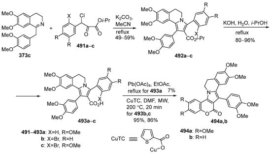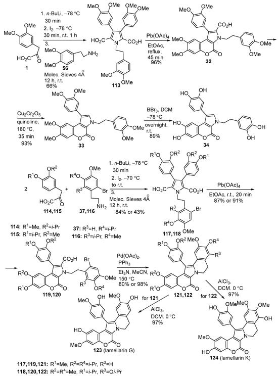 Peschko et al. developed the synthesis of marine alkaloids ningalin B (34), lamellarin G (123), and lamellarin K (124) in 52%, 56%, and 37% overall yields, respectively, utilizing as key step their earlier-applied method for the formation of 3,4-diarylpyrrole-2,5-dicarboxylic acids 113, 117, and 118 by cyclocondensation from arylpuruvic acids 1, 114, and 115 and 2-arylethylamines 56, 37, and 116, respectively [90]. Oxidation of acids 113, 117, and 118 by lead tetraacetate led to coumarin derivatives 32, 119, and 120 (Scheme 13). Decarboxylation of 32 with copper chromite to 33 and deprotection with BBr3 resulted in ningalin B (34). Palladium-catalyzed Heck reaction and cyclization of 119 and 120 afforded the pentacyclic lamellarin derivatives 121 and 122, respectively. Selective deprotection of isopropyl group of compounds 121 and 122 under treatment with aluminum trichloride resulted in lamellarin G (123) and lamellarin K (124), respectively.