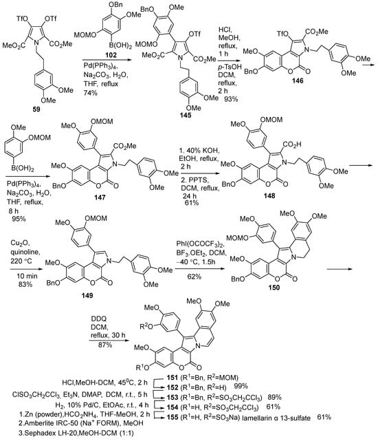 Fukuda et al. presented the synthesis of lamellarin α (158) and lamellarin α 13-sulfate (155), 20-sulfate (112), and 13,20-disulfate (159) using as common intermediate compound 151 with two different protecting groups, benzyl for 7-hydroxy coumarin moiety and methoxymethyl for 3-hydroxyphenyl moiety [94]. The reaction sequence started from penta-substituted pyrrole 59, which by Suzuki cross-coupling with boronic acid 102 provided arylpyrrole derivative 145. Hydrolysis and cyclization of 145 led to pyrrolo[2,3-c]coumarin 146. A new Suzuki reaction with MOM-protected boronic acid afforded derivative 147. Hydrolysis of the latter followed by decarboxylation, oxidation–cyclization with PIFA, and aromatization by DDQ resulted in the common intermediate 151 (Scheme 16).