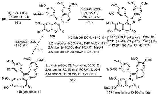 Deprotection of MOM group of 151 with hydrochloric acid to 3-hydroxyaryl derivative 152 and reaction with 2,2,2-trichloroethyl chlorosulfate furnished sulfate 153, which by hydrogenolysis and reductive deprotection of 2,2,2-trichloroethyl ester 154 with Zn-HCO2NH4 followed by ion exchange with Amberlite and Sephadex purification resulted in lamellarin α 13-sulfate (155) in 6% overall yield from 59. Intermediate 151 under hydrogenolysis to hydroxycoumarin derivative 156 and reaction with 2,2,2-trichloroethyl chlorosulfate provided ester 157, which by MOM deprotection led to 3-hydroxyaryl compound 111 (Scheme 16). Treatment, in analogy to the above-mentioned transformation of 154 to 155, afforded lamellarin α 20-sulfate (112) in 8% total yield from 59. Deprotection of MOM group of 156 with hydrochloric acid resulted in lamellarin α (158) in 12% overall yield from 59, which by the reaction with pyridine-SO3 complex and ion exchange with Amberlite and purification by Sephadex led to lamellarin α 13,20-disulfate (159) in 8% total yield from 59.