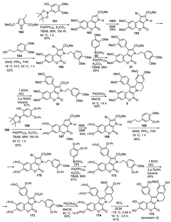 Hasse et al. synthesized lamellarin G trimethyl ether (5) and lamellarin S (175) in 7% and 15% overall yields, respectively, starting from the iodopyrrole derivative 160 [95]. Suzuki cross-coupling reaction of 160 with boronic acid 161 followed by spontaneous lactonization afforded pyrrolo[2,3-c]coumarin derivative 162, which by selective bromination with NBS provided bromide 163 (Scheme 17). N-alkylation of the latter under Mitsunobu conditions furnished derivative 165, which by a new Suzuki coupling with boronic acid 60 generated compound 31. Compound 31, following the former method by Iwao [84], led to acid 32, which by decarboxylative Heck cross-coupling reaction resulted in lamellarin G trimethyl ether (5). Lamellarin S pentamethyl ether (174) was formed under a similar procedure starting from iodopyrrole derivative 160 and using boronic acids 166 and 171 and 2-arylethanol 169. Selective deprotection of isopropoxy group of 174 with BCl3 produced lamellarin S (175).