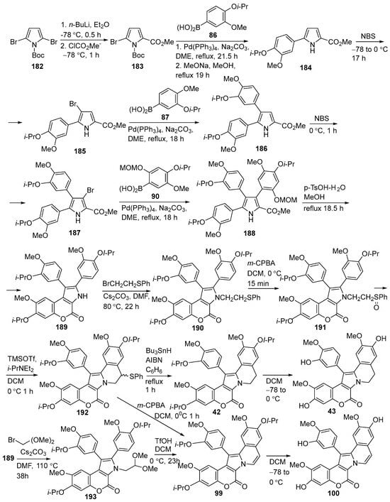 In 2014, Komatsubara et al., presented the synthesis of lamellarins L (43) and N (100) using as starting compound 3,4,5-differentially triarylated pyrrole-2-carboxylate as the 188 [97]. The 5-bromopyrrole-2-carboxylate 183 was synthesized from 2,5-dibromo-N-Bocpyrrole (182) through Br-Li exchange and methoxycarbonylation. This compound then underwent Suzuki cross-coupling reaction with boronic acid 86 to yield the 5-arylpyrrole-2-carboxylate derivative 184 (Scheme 19). Bromination with NBS to 185 and a second cross-coupling reaction with boronic acid 87 provided 4,5-diaryl pyrrole adduct 186. Bromination of the latter with NBS furnished 3-pyrrole derivative 187, which was followed by a new Suzuki coupling with 90 to 3,4,5-triaryl pyrrole compound 188. Treatment with p-TsOH led to pyrrolo[2,3-c]coumarin compound 189. N-thioalkylation with bromoethyl phenyl sulfide provided thioether 190. Oxidation of the latter to 191 and Pummerer cyclization led to dihydroisoquinoline derivative 192. Radical desulfurization of 192 with Bu3SnH/AIBN provided lamellarin L triisopropyl ether (42), which by treatment with BCl3 resulted in lamellarin L (43) in 29% total yield. Treatment of 192 with m-CPBA furnished the lamellarin N triisopropyl ether (99) and by selective hydrolysis with BCl3 generated lamellarin N (100) in 34% total yield. In an alternative procedure for the synthesis of lamellarin N (100) in 42% overall yield, coumarin intermediate 189 was treated with bromoacetaldehyde dimethyl acetal to provide derivative 193, which was cyclized in the presence of TfOH to provide triisopropyl ether of lamellarin N 99.