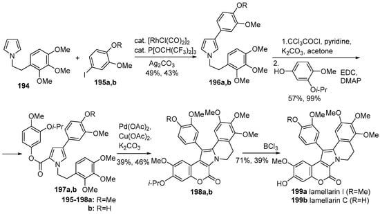 Ueda et al. completed the synthesis of lamellarins I (199a) and C (199b) using the Rh-catalyzed β-selective cross-coupling arylation of pyrroles [98]. Pyrrole derivative 194 reacted with aryl iodides 195a,b and selectively provided 3-arylpyrrole adducts 196a,b under Rh-catalysis (Scheme 20). Reactions of the latter with trichloroacetyl chloride followed by hydrolysis and esterification with 3-isopropoxy-4-methoxyphenol afforded pyrrole-2-carboxylates 197a,b, which by oxidative coupling and double C-C bond formation in the presence of stoichiometric Pd(OAc)2, Cu(OAc)2, and K2CO3 furnished the isopropyl ethers of lamellarins I and C 198a,b. Finally, deprotection of isopropoxy group resulted in lamellarins I (199a) and C (199b).