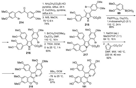 Pyrrole core 215 was the key step for the synthesis of lamellarin D trimethyl ether (218) and lamellarin H (181) presented by Dialer et al. [101]. The electrocyclic ring closure of the adduct generated in situ from the chalcone 214 and glycine ethyl ester hydrochloride in the presence of Cu(OAc)2 and NIS afforded pyrrole 215. Suzuki cross-coupling reaction of 215 with boronic acid 60 afforded 3,4,5-triaryl substituted pyrrole-2-carboxylate 216 (Scheme 23). N-alkylation of the latter with bromoacetaldehyde dimethyl acetal followed by intramolecular cyclization in the presence of triflic acid in a Pomeranz–Fritsch one-pot reaction led to isoquinoline product 217. After saponification and cyclization of sodium salt with copper (I) thiophene-2-carboxylate under microwave irradiation in an Ullmann-type reaction, the lamellarin D trimethyl ether (218) was obtained in 54% yield from chalcone. Deprotection with BBr3 resulted in lamellarin H (181) in 53% yield from chalcone.