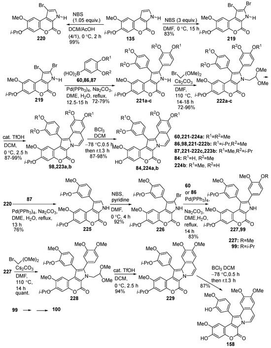 In 2017, Fukuda et al. synthesized lamellarins η (224a) and D (84) and 5,6-dehydrolamellarin Y (224b) via a different method started from 7-isopropyl-8-methoxy-[1]benzopyrano[3,4-b]pyrrol-4(3H)-one (135), prepared from N-benzenesufonyl-1H-pyrrole (131) [92]. Bromination of 135 with excess NBS led to dibromo-derivative 219, while, with one equivalent of NBS in DCM/AcOH (4:1), the monobromo-derivative 220 formed (Scheme 24). Suzuki cross-coupling reaction of 219 with boronic acids 60, 86, and 87 provided 2,3-diaryl-derivatives 221a–c, which, upon N-alkylation with bromo-acetaldehyde dimethyl acetal, furnished compounds 222a–c, respectively. TfOH-mediated cyclization of the latter afforded ethers 98 and 223a,b. Selective deprotection of isopropyl group by BCl3 resulted in lamellarins D (84) and η (224a) and 5,6-dehydrolamellarin Y (224b) in 48%, 40%, and 56% overall yields, respectively [102]. Suzuki cross-coupling of 220 with boronic acid 87 provided 3-aryl derivative 225, which upon bromination with NBS furnished bromo compound 226. New Suzuki coupling with boronic acids 60 and 86 afforded ethers 227 and 99, respectively. Compound 99 is the precursor for the synthesis of lamellarin N (100) [88]. Following the above-mentioned sequence by the N-alkylation of 227 with bromo-acetaldehyde dimethyl acetal, cyclization of 228 with TfOH, and selective hydrolysis of isopropyl group of 229 with BCl3, the lamellarin α (158) was isolated in 47% total yield.
