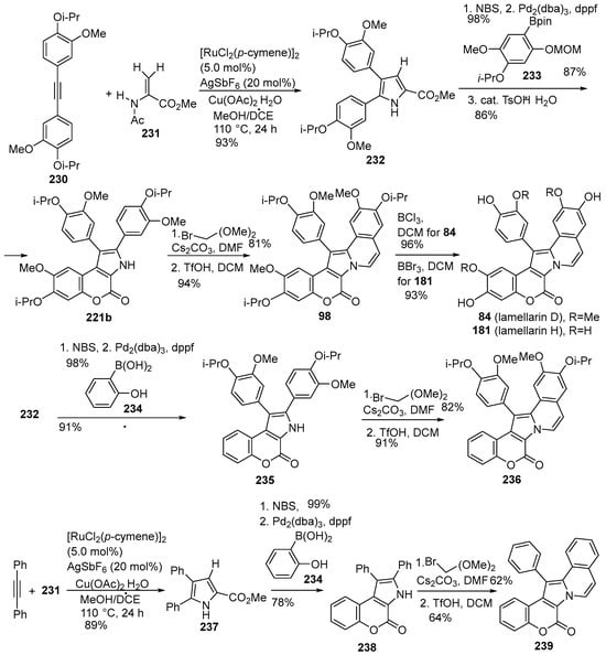 Ackermann and his colleagues presented the synthesis of lamellarins using the Ru-catalyzed C-H/N-H activation in an oxidation alkyne annulation process. So, the synthesis of pyrrole 232 was achieved from diaryl acetylene 230 and 2-aminoacrylate 231. Pd-catalyzed annulated formation of lactone 221b was obtained from 232 and boronate 233 in a one-pot bromination/Suzuki cross-coupling reaction procedure [103]. N-alkylation of compound 221b with bromo-acetaldehyde dimethyl acetal followed by cyclization led to ether 98, which by selective hydrolysis of isopropyl ether by BCl3 resulted in lamellarin D (84) in 55% total yield (Scheme 25). Deprotection of all ether groups in 98 by BBr3 afforded lamellarin H (181) in 54% overall yield. In this work, the lamellarin analogues 236 and 239 have been also prepared.