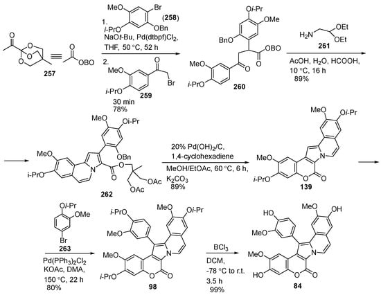 The same year, Shirley et al. demonstrated the synthesis of lamellarin D (84) in seven steps and 22% total yield from puruvic acid utilizing the puruvic acid orthoester 257 as building block for the synthesis of 1,4-dicarbonyl adduct 260, by Pd-catalyzed arylation of 257 with bromoaryl derivative 258, followed by enolate alkylation with α-bromoacetophenone 259 (Scheme 28). Treatment of 260 with amino acetaldehyde diethyl acetal (261) under reflux afforded the pyrrolisoquinoline compound 262, which under transfer hydrogenation and lactonization furnished the fused pyrrolocoumarin product 139. Pd-catalyzed C-H arylation of the latter with aryl bromide 263 led to triisopropyl lamelarine D (98), and finally selective deprotection with BCl3 resulted in lamellarin D (84) [105].