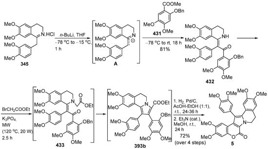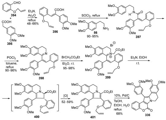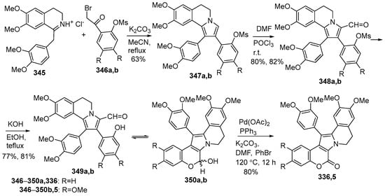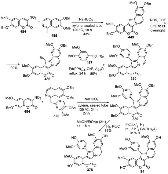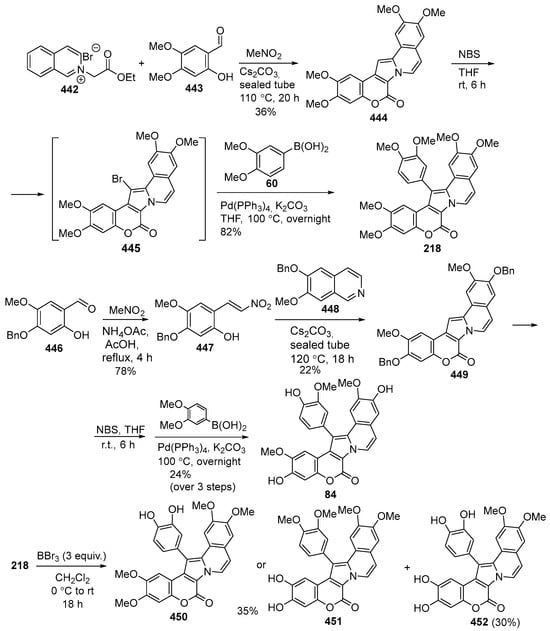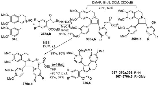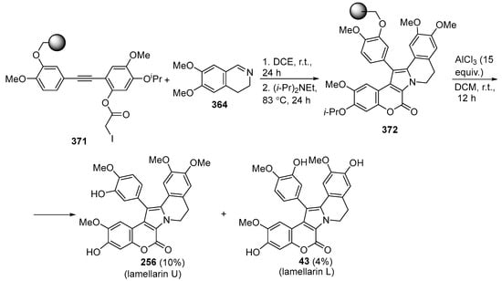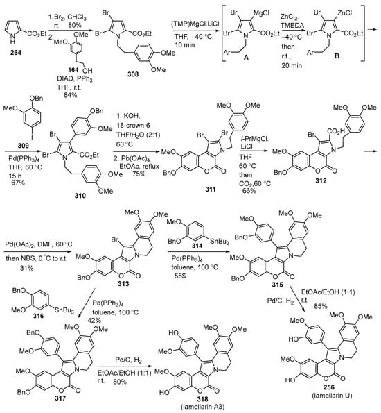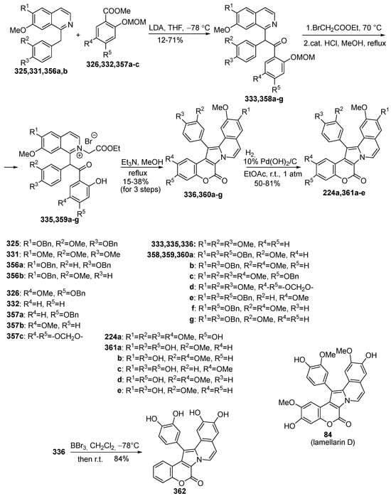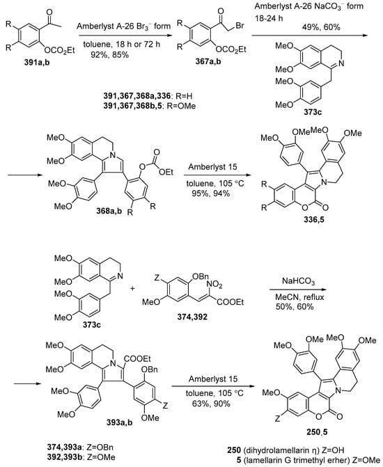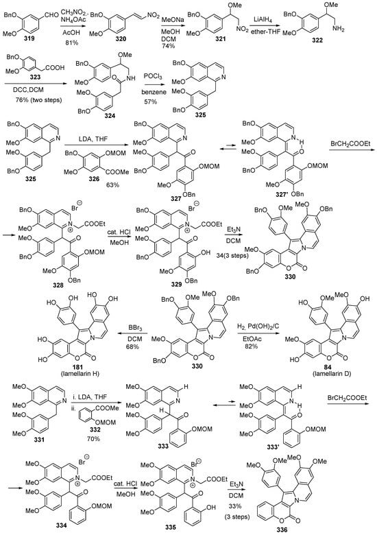 The synthesis of lamellarins was achieved mainly by pyrrole derivatives or isoquinoline derivatives as starting or intermediate compounds. In a few cases, coumarin derivatives were utilized as starting compounds.