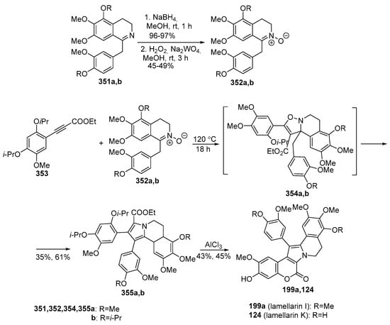 - Díaz, M.; Guitián, E.; Castedo, L. Syntheses of Lamellarins I and K by [3 + 2] Cycloaddition of a Nitrone to an Alkyne. Synlett 2001, 2001, 1164–1166. [Google Scholar] [CrossRef]