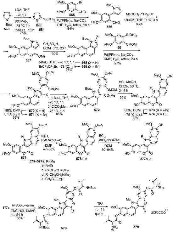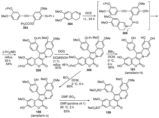 - Dialer, C.; Imbri, D.; Hansen, S.P.; Opatz, T. Synthesis of Lamellarin D Trimethyl Ether and Lamellarin H via 6π-Electrocyclization. J. Org. Chem. 2015, 80, 11605–11610. [Google Scholar] [CrossRef]