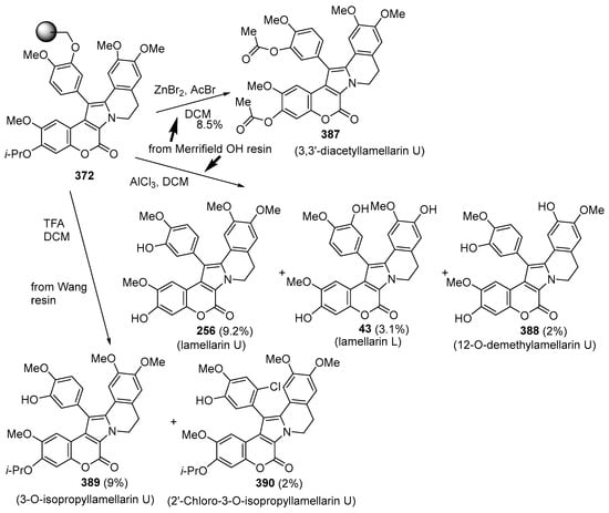 - Cironi, P.; Cuevas, C.; Albericio, F.; Álvarez, M. Gaining diversity in solid-phase synthesis by modulation of cleavage conditions from hydroxymethyl-based supports. Application to lamellarin synthesis. Tetrahedron 2004, 60, 8669–8675. [Google Scholar] [CrossRef]