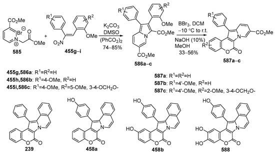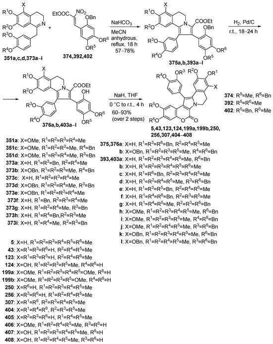 - Silyanova, E.A.; Samet, A.V.; Semenov, V.V. A Two-Step Approach to a Hexacyclic Lamellarin Core via 1,3-Dipolar Cycloaddition of Isoquinolinium Ylides to Nitrostilbenes. J. Org. Chem. 2022, 87, 6444–6453. [Google Scholar] [CrossRef] [PubMed]