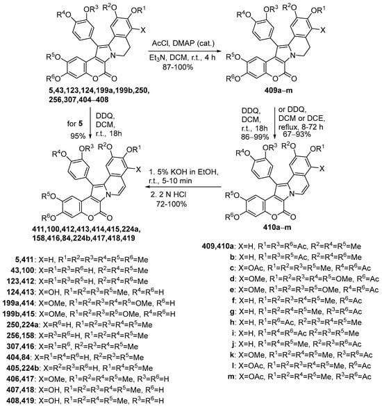 Coumarin (2H-1-benzopyran-2-one) derivatives are widely distributed in nature as secondary metabolites from plants, bacteria, fungi, and marine microorganisms [1,2,3,4,5,6,7,8,9,10,11]. Different derivatives of coumarins, natural or synthetic, possess diverse biological properties [12,13], such as anticancer [14,15], anti-inflammatory [16,17], anticoagulant [18,19], anti-HIV [20,21], antidiabetic [22,23], antibiotic [24,25], antitubercular [26,27], neuroprotective [28,29], etc. Fused coumarins also possess biological activities, and many of them, like furocoumarins [30,31], pyranocoumarins [32], pyridocoumarins [33,34], or pyrrolocoumarins [34,35,36], are isolated from nature. Fused pyrrolocoumarins present interesting biological activities, such as cytotoxic [37,38], antioxidant [39], anti-inflammatory [39,40], multidrug resistance (MDR) reversal [37], and act as benzodiazepine receptor (BZR) ligands [41,42], angiogenesis inhibitors [43], DYRK1A inhibitors [37,44], Wnt signaling inhibitors [45], or fluorescent sensors for live cell imaging [46]. The classes of lamellarins (Figure 1) and their related compounds (Figure 2) are the most important among [3,4]-fused pyrrolocoumarins. Lamellarins have been isolated from diverse marine organisms, such as sponges, ascidians, mollusks, and tunicates, and they are divided into two main groups [47,48,49,50,51]. Type I contains a fused pyrrole ring, while type II has a non-fused pyrrole ring (e.g., lamellarins Q and R). Type I lamellarins involve compounds with the fused piperidine ring being saturated (type Ia) (e.g., lamellarins A, C, G, J, etc.) or with an unsaturated piperidine ring (type Ib) (e.g., lamellarins B, W, D, H, etc.).