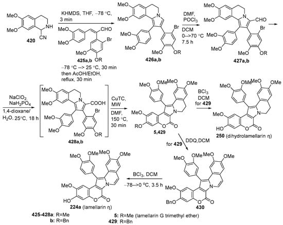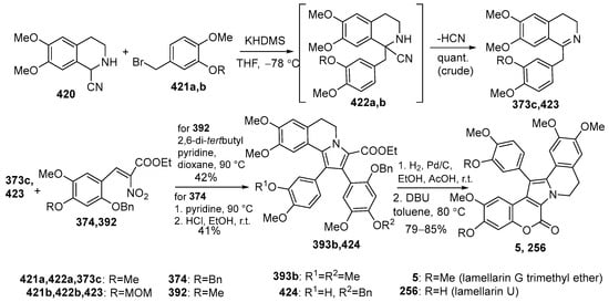 - Morikawa, D.; Morii, K.; Yasuda, Y.; Mori, A.; Okano, K. Convergent Total Synthesis of Lamellarins and Their Congeners. J. Org. Chem. 2020, 85, 8603–8617. [Google Scholar] [CrossRef] [PubMed]
