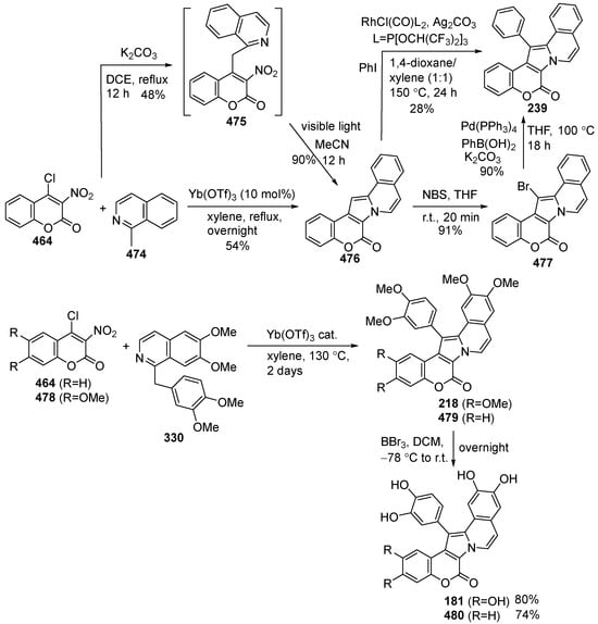 - Manjappa, K.B.; Syu, J.-R.; Yang, D.-Y. Visible-Light-Promoted and Yb(OTf)3-Catalyzed Constructions of Coumarin-Pyrrole-(Iso)quinoline-Fused Pentacycles: Synthesis of Lamellarin Core, Lamellarin D Trimethyl Ether, and Lamellarin H. Org. Lett. 2016, 18, 332–335. [Google Scholar] [CrossRef]