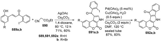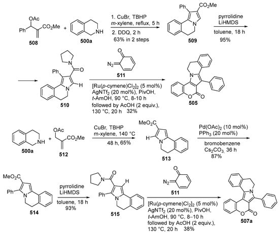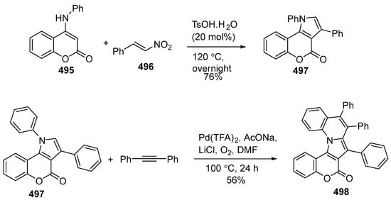 - Chen, L.; Xu, M. A New Approach to Pyrrolocoumarin Derivatives by Palladium-Catalyzed Reactions: Expedient Construction of Polycyclic Lamellarin Scaffold. Adv. Synth. Catal. 2009, 351, 2005–2012. [Google Scholar] [CrossRef]