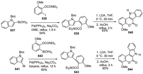 - James, C.A.; Coelho, A.L.; Gevaert, M.; Forgione, P.; Snieckus, V. Combined Directedortho and Remote Metalation−Suzuki Cross-Coupling Strategies. Efficient Synthesis of Heteroaryl-Fused Benzopyranones from BiarylO-Carbamates. J. Org. Chem. 2009, 74, 4094–4103. [Google Scholar] [CrossRef] [PubMed]