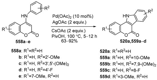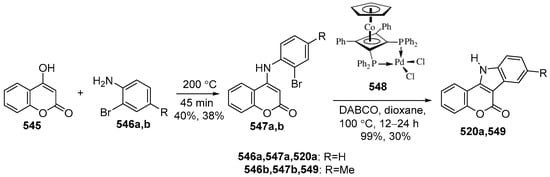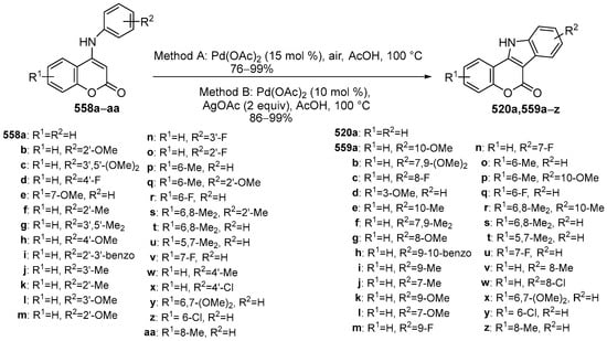 - Wu, J.; Lan, J.; Guo, S.; You, J. Pd-Catalyzed C–H Carbonylation of (Hetero)arenes with Formates and Intramolecular Dehydrogenative Coupling: A Shortcut to Indolo[3,2-c]coumarins. Org. Lett. 2014, 16, 5862–5865. [Google Scholar] [CrossRef]