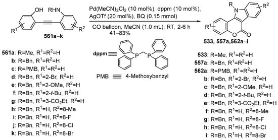 - Ding, D.; Zhu, G.; Jiang, X. Ligand-Controlled Palladium(II)-Catalyzed Regiodivergent Carbonylation of Alkynes: Syntheses of Indolo[3,2-c]coumarins and Benzofuro[3,2-c]quinolinones. Angew. Chem. Int. Ed. 2018, 57, 9028–9032. [Google Scholar] [CrossRef]