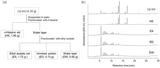 Solvent fractionation of crude Cp extract. (a) Fractionation scheme. (b) HPLC chromatograms of crude extract and sub-fractions. HX, n-hexane; EA, ethyl acetate; ED, unmixed portion of EA and DW fractions; DW, distilled water.