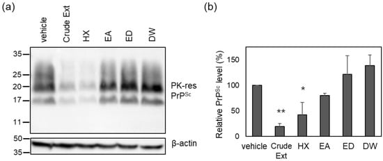 The level of PK-resistant PrPSc in the cells incubated with solvent-extracted Cp fractions. (a) A representative Western blot of PK-resistant (res) PrPSc. The crude Cp extract was evaluated for anti-prion activity at a concentration of 50 μg/mL, and each solvent-extracted fraction was used to incubate ScN2a cells at the concentration of assigned weight ratios as in Table S1. (b) Densitometry analysis of PK-resistant PrPSc. n = 4. * p-value < 0.05; ** p-value < 0.01.