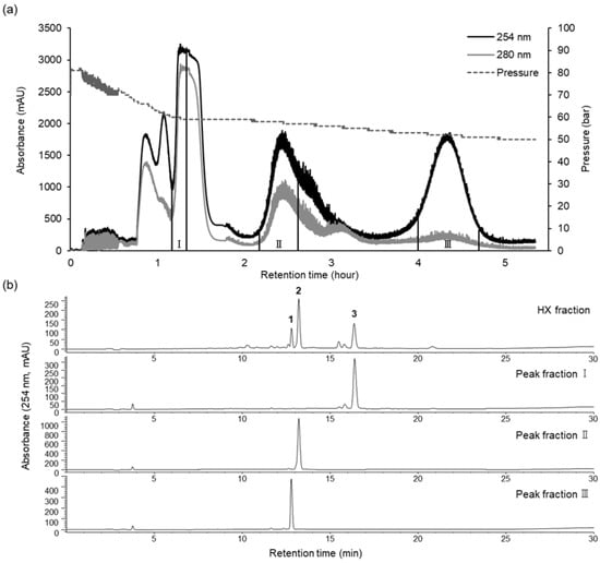 CPC chromatogram of the HX fraction (a) and HPLC analysis of CPC peak fractions I–III (b). CPC conditions: two-phase solvent system, n-hexane:ethanol:water (10:7:3, v/v/v); ascending mode; flow rate of 10 mL/min; rotation speed of 1200 rpm; monitored at 254 (black line) and 280 (gray line) nm. HPLC conditions are the same as those described above.
