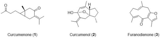 The structural identification of CPC peak fractions (I–III) was carried out by ESI-MS, 1H-, and 13C-NMR (Figures S2–S8). In comparison to the reported data [31], the chemical structures of peak fractions I–III were elucidated as curcumenone (1), curcumenol (2), and furanodienone (3), respectively (Figure 4). Interestingly, none of these compounds shares chemical identity with curcumin, a compound widely found in the Curcuma genus and previously reported to inhibit PrP fibrilization and PrPSc accumulation in vitro [10].