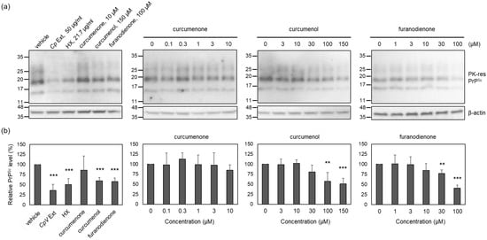 Curcumenone (1), curcumenol (2), and furanodienone (3) (purity ≥ 98%) were purchased from Chemfaces (Wuhan, China). The compounds were dissolved in dimethyl sulfoxide and used for the assays. The cytotoxicity of the compounds was determined by MTT assay as previously described [32]. Briefly, ScN2a cells were cultured with the compounds for 4 days, and the level of formazan formation from MTT agents (Sigma, St. Louis, MO, USA) by cellular enzymes was measured with the Infinite M200Pro Multimode Reader (Tecan, Männedorf, Switzerland) at 570 nm. The level of PrPSc in ScN2a cells was analyzed as previously described [13]. Briefly, ScN2a cells were cultured with the compounds for 4 days at non-cytotoxic concentrations (>90% of cell viability), and proteinase K (PK) (Roche, Basel, Switzerland)-resistant PrPSc in cell lysates was analyzed by Western blotting using mouse monoclonal anti-PrP antibody 6D11 (Biolegend, San Diego, CA, USA). Separately, β-actin, as a loading control marker, was detected using mouse monoclonal anti-β-antibody AC-15 (Santa Cruz Biotechnology, Dallas, TX, USA). Densitometry of Western blots was performed using Gene Tools 4.1 software (Syngene, San Diego, CA, USA). Student’s t-test was used for statistical analysis.