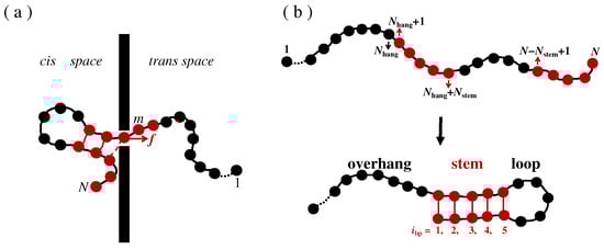 The translocation of hairpin polymers through nanopores is simulated in a three-dimensional (3D) system. The 3D system is presented in Figure 1a as a 2D sketch. The hairpin polymer is modeled using the CGBS model. N beads with diameter σ are connected into a linear chain and then folded into the hairpin structure, with the hairpin structure consisting of a single-stranded overhang part, a double-stranded stem part, and a single-stranded loop. The lengths of each part are set as Nhang, Nstem, and Nloop, respectively; thus, the chain length N = Nhang + 2Nstem + Nloop. As shown in Figure 1b, each monomer is marked sequentially with the serial number i = 1 to N according to its position along the chain. The monomers in the first stem part (Nhang + 1 ≤ i ≤ Nhang + Nstem) are sequentially bonded to the monomers in the second stem part (N ≥ i ≥ N − Nstem + 1) through hydrogen bond (HB) interactions, thus forming base pairs (bps) with serial number ibp = 1 to Nstem.
