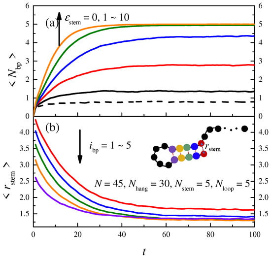 The plot (b) shows the variation in the mean distance in bps <rstem> with simulation time t; the interaction strength for the HB potential is set as εstem = 6. The plot (a) shows the dependence of the number of hydrogen bonds <Nbp> on t; the lines from bottom to top represent polymers with attractive strength εstem = 1, 2, 3, 5, and 10; the dashed line represents the linear polymer chain.