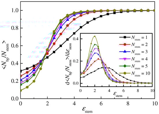 The dependence of the base pair ratio <Nbp/Nstem> when t = 100 on the interaction εstem for polymers with different numbers of base pairs Nstem is plotted in Figure 3. We find that the ratio <Nbp/Nstem> is increased gradually with εstem and gradually approaches 1 at a large εstem. We also find that, for polymers with only one or two base pairs, the increase in <Nbp/Nstem> is slower, meaning that the polymer requires greater interaction strength to form a hairpin structure. For the case with Nstem ≥ 3, <Nbp/Nstem> reaches 1 at approximately εstem = 4. The inset of Figure 3 shows the variation rate d<Nbp/Nstem>/dεstem. We can see that, for polymers with Nstem ≥ 3, the maximum point εstem* for the changing rate is approximately εstem* = 2, and the ratio <Nbp/Nstem> is approximately 0.5 when εstem = 2 from the main plot. Thus, for Nstem ≥ 3, we can divide the attractive strength into three regions: a linear polymer region when εstem < 2; an unsteady hairpin polymer region at 2 < εstem < 4; and a steady hairpin polymer region at εstem > 4.