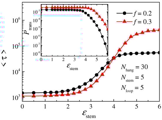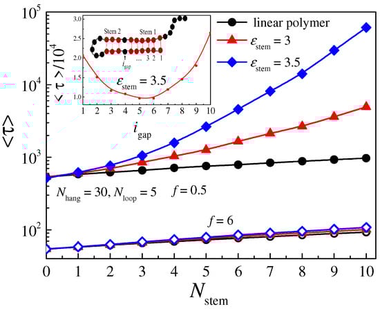 The influence of the length of the stem part Nstem on the translocation time <τ> is also studied, and the results are shown in Figure 10. The lengths of the overhang part and loop part are set as Nhang = 30 and Nloop = 5, respectively, and the length of the stem part Nstem varies from 0 to 10. The attractive strength εstem is set as 3 and 3.5 and the driving force is set as f = 0.5 and 6 for slow and fast translocation conditions, respectively. We can see that, when the driving force is large, <τ> is very close to <τ0> and increases linearly with Nstem. Meanwhile, under the weak driving force condition, <τ> increases quickly with Nstem and thus separates from <τ0> at a large Nstem. The dependence of <τ> on Nstem is nonlinear because the two strands in the stem part tend to distort into a steady helix structure to increase the entropy. Thus, the effect of the driving force in dissociating the base pairs during translocation can be divided into two components, with one pulling parallel to the bases to unzip the base pairs and one stretching transverse to the base pairs to unwind the helical stem part into two parallel strands [38]. The time scale for the unzipping process is proportional to the number of base pairs, while the unwinding process is much more complicated. The greater the number of base pairs, the more complicated the process for the helical stem part and the more time needed for the unwinding process.