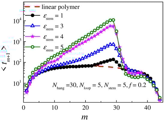 The distribution of the mean residence time <tm+1> for the (m+1)th monomer remaining at the nanopore. The length of each part of the hairpin polymer is set as Nhang = 30, Nstem = 5, and Nloop = 5, respectively; the driving force is set as f = 0.2. The red dashed line represents the linear polymer with length N = 45; the other lines represent hairpin polymers with different attractive strength εstem.