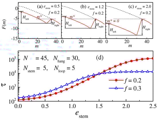 To further study the residence time, we theoretically calculate the free energy F(m) and the translocation time τFP of the hairpin polymers with different stem interactions estem during translocation, and the results are shown in Figure 6. We can see from the plot (d) that although the theoretical parameters of τFP and estem are not numerically identical to τ and εstem in the simulation, the dependence of τFP on estem is consistent with the simulation results in Figure 4, which also shows three regions. The different free-energy landscapes for the three regions are shown in plots (a) to (c), respectively. The dashed line (linear polymer) decreases monotonically under the effect of the driving force, while the sold line (hairpin polymer) firstly decreases from a lower starting point, reaching a minimum at m = Nhang − 1, and then increases with the unfolding of the stem structure until it coincides with the dashed line when m > Nhang + Nstem [25,26]. The non-monotonic change in the solid line leads to an energy well in the free-energy landscape of the hairpin polymer. The position of the energy well is coincident with the range of the triangle area in Figure 5. m* is defined as the point where F(m*) = F(Nhang + Nstem), and the residence time can be explained by the position of the monomer trapped in the well. The peak point of <tm+1> corresponds to the bottom of the energy well, and <tm+1> decreases as the monomers move away from the bottom. The monomers in the well can either overcome the folding energy barrier Hright to pass into the trans side or overcome the left barrier Hleft to thread back into the cis side, so that the translocation behavior is related to the width and depth of the free-energy well.