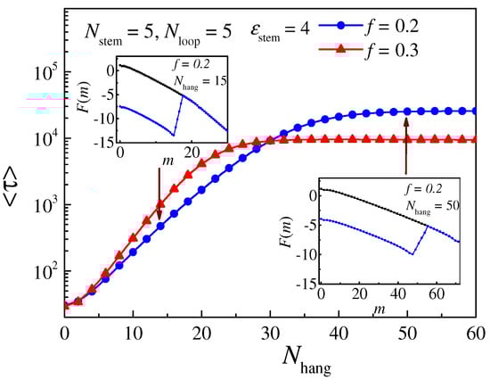 The relationship between the translocation time τ and the length of the overhang part Nhang. The lengths of the stem and loop part are set as Nstem = 5 and Nloop = 5, respectively; the length of the overhang part varies from 0 to 60; and the driving force is set as f = 0.2 (blue line with circle point) and f = 0.3 (red line with triangle point), respectively. The attractive strength εstem = 4. The insets show the free-energy landscape for the hairpin polymer in two regions.
